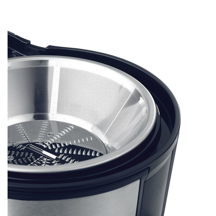 این آبمیوهگیری به دو مخزن آبمیوه و تفاله مجهز است که هرکدام به صورت جداگانه کنار دستگاه قرار میگیرند.