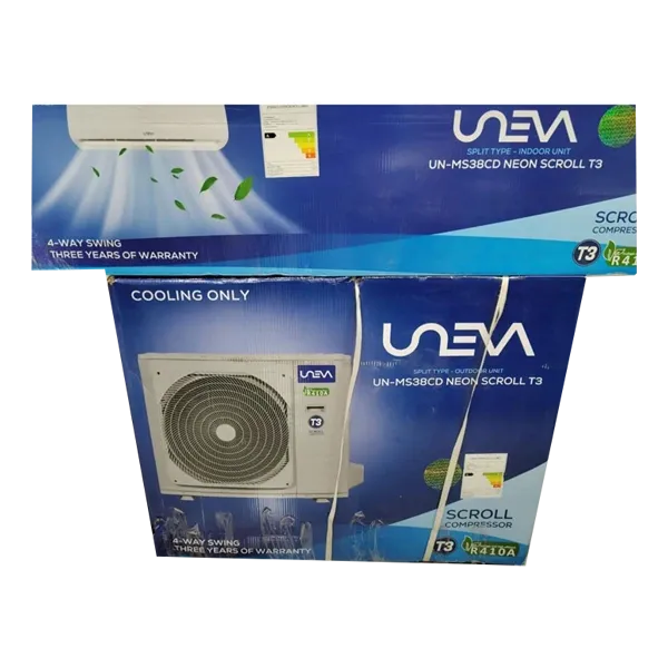 کولر گازی یونیوا مدل UN‑MS24CD NEON SCROLL با ظرفیت سرمایشی ۲۴۰۰۰ BTU جزو دستگاههای پرقدرت رده خانگی و اداری محسوب میشود. بهکارگیری گاز مبرد R410a در کنار کمپرسور اسکرول باعث افزایش بازده و کاهش فشار کاری دستگاه شده و همین امر موجب شده در دماهای بالا نیز عملکردی پایدار داشته باشد.