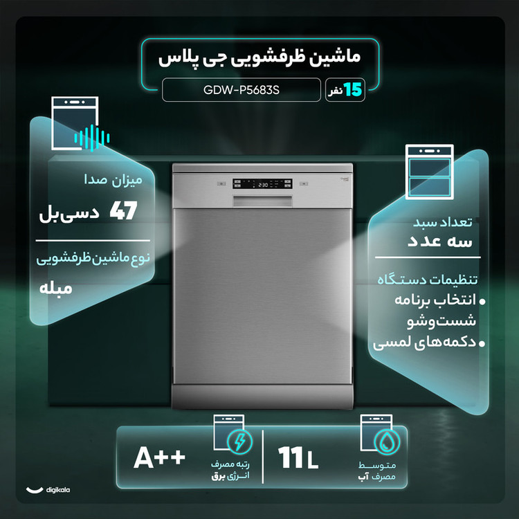 این ماشین ظرفشویی با ارتفاع 84.5 سانتیمتر، عمق 60 سانتیمتر و پهنای 59.8 سانتیمتر مشکلی بابت جایگیری در آشپزخانه شما نخواهد داشت. طراحی مبله آن، به دکوراسیون آشپزخانه شما زیبایی خاصی میبخشد و با نمای استیل ضد لکه خود، علاوه بر ظاهری شگفتانگیز از ماندن اثرانگشت بر روی بدنه آن جلوگیری میکند. باتوجهبه ظرفیت بالای 15 نفره آن نگرانی بابت انباشته شدن ظروف کثیف بعد از مهمانیها وجود نخواهد داشت. ماشین ظرفشویی جی پلاس مدل GDW-P5683S با سه سبد مجزا، فضای کافی برای قرارگیری انواع ظروف، از لیوانهای ظریف گرفته تا قابلمههای بزرگ را فراهم میکند. سبد سوم آنهم باقابلیت تنظیم ارتفاع، امکان چیدمان راحتتر و استفاده بهتر از فضا را فراهم میآورد. علاوه بر ظرفیت بالا این مدل مجهز به قابلیتهای هوشمند بینظیری چون سنسور تشخیص میزان کثیفی ظروف است که بهصورت خودکار شدت شستشو را بر اساس میزان آلودگی ظروف تنظیم میکند و در مواردی که ظرفها خیلی چرب نیستند صرفهجویی در مصرف آب و انرژی را در دستور کار خود قرار میدهد. برنامههای شستشوی این ماشین ظرفشویی، شستشوی روزانه 90 دقیقهای تا شستشوی پرقدرت برای ظروف بسیار کثیف را شامل میشود که هرکدام در شرایط مختلف میتواند مورداستفاده قرار گیرد. برنامه شستشوی اقتصادی (Eco) در این مدل، با مصرف کمترین میزان آب (تنها 11 لیتر در هر شستشو)، انرژی و هزینهها را کاهش میدهد و درعینحال، به حفظ محیطزیست هم کمک شایانی خواهد کرد. همچنین، برای زمانهایی که ظروف کمی برای شستن وجود دارد، جی پلاس مدل GDW-P5683S میتواند با نصف ظرفیت خود شستشو را انجام دهد. این ماشین ظرفشویی تنها با ایجاد 47 دسیبل صدا، جزو ماشین ظرفشوییهای بسیار کمصدا محسوب میشود. نمودار مصرف انرژی A++ نشان میدهد که علاوه بر عملکرد مناسب، بسیار کممصرف است و بهصرفه جویی در هزینههای انرژی کمک میکند. ماشین ظرفشویی جی پلاس مدل GDW-P5683S با 7 برنامه شستشوی مختلف و امکانات ویژه مذکور، به داشتن آشپزخانهای مرتب و تمیز کمک میکند و تجربهای آسان و بیدردسر از شستشوی ظروف را به ارمغان میآورد. با این دستیار هوشمند، وقت بیشتری برای لذت بردن از زندگی در کنار خانواده خود خواهید داشت.