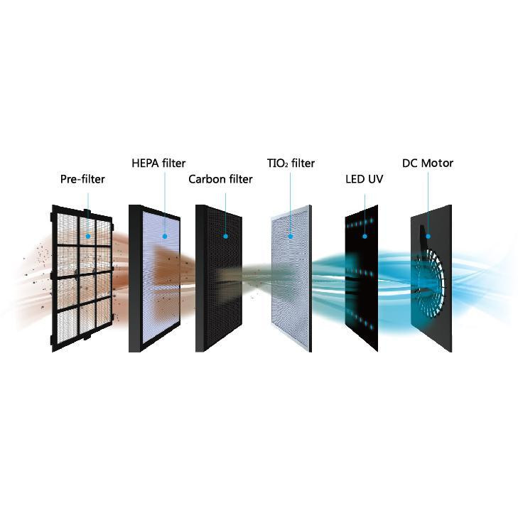 فیلتر هپا، فیلتر کربن اکتیو ، فیلتر دی اکسید تیتانیوم (فتو کاتالیست)، پیش فیلتر
